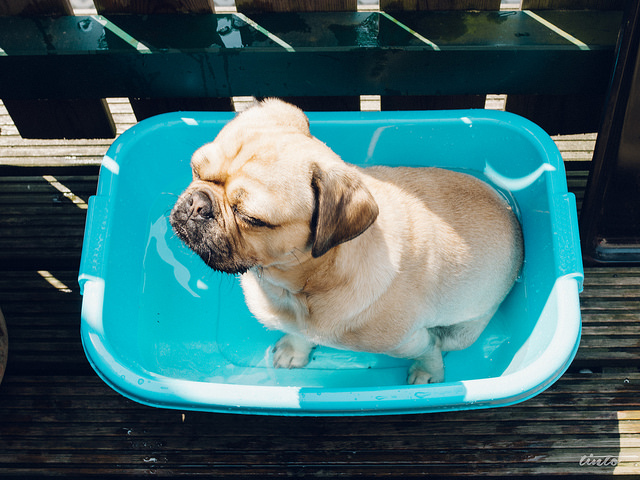 Si tenemos un perro de talla pequeña es muy fácil improvisarle una piscina en casa, tan sólo debemos buscar un barreño lo suficientemente grande para que pueda chapotear dentro.